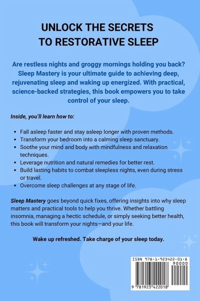 Discover a tranquil night's sleep and wake up refreshed, even if you've battled insomnia for years without success. Are you tired of tossing and turning, trapped in a cycle of sleepless nights and exhausting days? Have you tried countless remedies to no avail, longing for a peaceful slumber? Do you yearn for an energizing, restful sleep that allows you to approach each day with clarity and vitality? If so, you're not alone. Many people face these daily challenges, seeking solutions that go beyond generic advice. Imagine drifting into a deep, rejuvenating sleep, and awakening each morning feeling energized and healthy. This isn't a fantasy; it's a reality waiting for you to grasp! Here's a glimpse of what you'll uncover inside Sleep Mastery:Scientifically-backed natural remedies proven to enhance sleep quality. How to reset your circadian rhythm and maintain a consistent sleep schedule without drastic lifestyle changes. Simple sleep hygiene practices that create a tranquil bedroom sanctuary, leading to better sleep. Understanding and managing stress with effective techniques for bedtime relaxation. The surprising role of diet and exercise in promoting better sleep-uncover which foods and activities will aid your journey. How to quiet a racing mind to fall asleep effortlessly even in stressful situations. How technology can be used to track and improve your sleep patterns. Why blue light is your enemy - and straightforward tips to combat its effects. How mindfulness and meditation can transform your sleep experience with step-by-step guidance. Expert advice on recognizing sleep disorders and when to seek professional help. ...and so much more! You might be thinking, "I've tried everything, and nothing works for me." But Sleep Mastery isn't your typical sleep guide. It's a revolutionary resource that combines structured programs and scientifically-backed advice to inspire real change. Whether you're struggling to incorporate solutions into your busy schedule or doubting the effectiveness of natural methods, this book offers practical, adaptable strategies proven to improve your sleep. By integrating actionable plans that fit seamlessly into your life, you will embark on a path to restful sleep and a more fulfilling life. If you're ready to embrace natural, effective solutions to conquer insomnia and rejuvenate your life with better sleep, get your copy now!