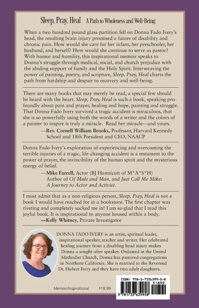 When a two hundred pound glass partition fell on Donna Fado Ivery's head resulting in brain injury, disability, and chronic pain, she could no longer count on walking, speaking, thinking, or caring for her infant and preschool children and husband. In her eighth year as pastor, her ministry, too, seemed terminally compromised. With words awash, she painted her prayers and discovered in the images her path toward healing. This inspirational memoir shares her struggle through medical, social, and church prejudice, and her support through the loving bond of family, community, and spirit. It was only through faith, prayer, and a new understanding of the miraculous ways that the Holy Spirit can work in our lives that she was able to eventually rise, function, realize and share a newly refreshed and ever-unfolding relationship with God. Sleep, Pray, Heal: A Path to Wholeness and Well-Being charts the path through hardship and despair and offers a map—through scripture, theology, poetry, painting, and storytelling— to faith, healing, recovery, and well-being. Book two of this Healing Memoir series, Sleep, Pray, Fly: Spirit Journey to Healing is forthcoming. For more information, see the author's website, www.DonnaFadoIvery.com, or www.AdventuresInHealing.com. DONNA FADO IVERY is an artist, spiritual leader, inspirational speaker, teacher, and writer. Her celebrated healing journey from a disabling head injury makes Donna a sought- after speaker on spiritual resources for living with chronic pain. Ordained in the United Methodist Church, Donna has pastored congregations in Northern California. She is married to the Reverend Dr. Hubert Ivery and they have two adult daughters.