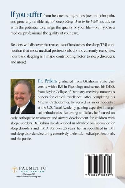 Tired of being tired? Discover Dr. Perkins' illuminating book on the importance of good sleep and how bad sleep causes a multitude of health problems you might not even realize. If you suffer from headaches, migraines, jaw and joint pain, and generally terrible nights' sleep, Dr. Ronald Perkins is about to change your life. In Sleep Well to Be Well, Dr. Perkins provides practical advice for dentists, physicians, healthcare providers, and the general public on the many illnesses and ailments poor sleep can bring. Readers can expect to discover:The true cause of headaches, migraines, and jaw joint pain. The sleep/TMJ connection that most medical professionals do not currently recognize. How back sleeping is a major contributing factor to sleep disorders. And much more! Thanks to Dr. Perkins' evidence-based clinical research, Sleep Well to Be Well is a handy reference for physicians, dentists, and students within these specialties to recognize sleep disorders and how to treat the actual cause, not just symptoms. However, it's also accessible enough for the general public and helps bad sleepers understand the cause of many health problems. They'll learn how their health issues might be related to their sleep and how to discuss them with their personal team of medical professionals. Get ready for a better night's sleep! Pick up your copy of Sleep Well to Be Well today.