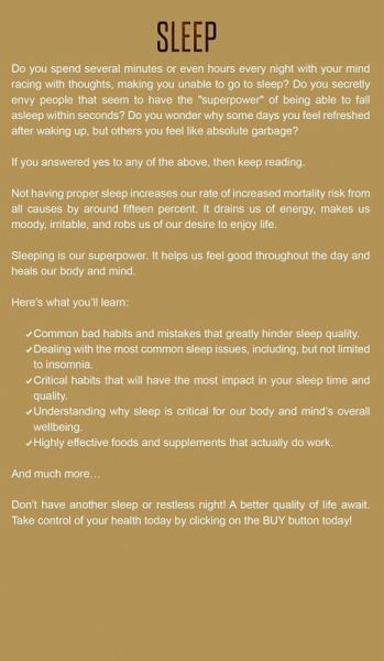 Here’s what you’ll learn: -Common bad habits and mistakes that greatly hinder sleep quality. -Dealing with the most common sleep issues, including, but not limited to insomnia. -Critical habits that will have the most impact in your sleep time and quality. -Understanding why sleep is critical for our body and mind’s overall wellbeing. -Highly effective foods and supplements that actually do work. And much more… Don’t have another sleep or restless night! A better quality of life await. Take control of your health today by clicking on the BUY button today!