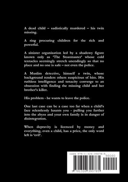 A dead child - sadistically murdered - his twin missing. A ring procuring children for the rich and powerful. A sinister organisation led by a shadowy figure known only as 'The Stoatmaster' whose cold tentacles seemingly stretch unendingly so that no place and no one is safe - not even the police. A Muslim detective, himself a twin, whose background renders others suspicious of him. His ruthless intelligence and tenacity converge to an obsession with finding the missing child and her brother's killer. His problem - he wants to leave the police. One last case can be a case too far when a child's face relentlessly haunts you - pulling you further into the abyss and your own family is in danger of disintegration. When depravity is licenced by money and everything, even a child, has a price, the only word left is 'evil'.