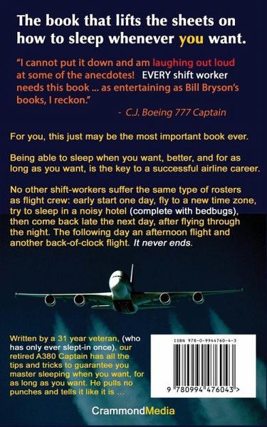 THE BOOK THAT LIFTS THE SHEETS ON HOW TO SLEEP WHENEVER YOU WANT ... AND MORE This may turn out to be the most important book you've ever read. Being able to sleep when you want, for as long as you want, is the key to a successful airline career. No other shift-workers suffer the same type of rosters as flight crew: early start one day, fly to a new time zone, try to sleep in a noisy hotel (complete with bedbugs), then come back late the next day, flying all through the night. The following day it's off again with an afternoon start and another back-of-clock flight. It never ends. Written by a 31 year veteran, (who has only ever slept-in once), our retired A380 Captain has all the tips and tricks to guarantee you master sleeping when you want, better, and for as long as you want. An Aussie, he pulls no punches and tells it like it is …