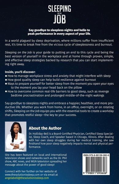 Say goodbye to sleepless nights and hello to peak performance in every aspect of your life. In a world plagued by sleep deprivation, where millions suffer from insufficient rest, it's time to break free from the vicious cycle of sleeplessness and burnout. Sleeping on the Job is your guide to putting an end to this cycle and being the best version of yourself in the workplace and at home through proven, simple, and effective sleep strategies backed by research that you can start implementing right away. Inside, you'll discover:How to manage workplace stress and anxiety that might interfere with sleep How good quality sleep can help build resilience against burnout Ways to prepare yourself for better sleep from the moment you open your eyes to the moment you lay your head back on the pillow How to overcome common real-life barriers to good sleep, such as revenge bedtime procrastination and prolonged middle-of-the-night wakings Say goodbye to sleepless nights and embrace a happier, healthier, and more productive life. Whether you work from home, in an office, overnight, or on rotating shifts, Sleeping on the Job equips you with the essential tools to create a workday that promotes restful sleep-the key to your success. Dr. Holliday-Bell is a Board-Certified Physician, Certified Sleep Specialist, Sleep Coach, and Speaker based in Chicago, Illinois. After dealing with her own sleep struggles during her medical training, she saw firsthand how poor sleep negatively impacts mental and physical performance. She has been featured on local and international television shows and networks such as the Dr. Phil show, ABC news, and WGN television spreading her message about the power of good sleep! Connect with her further on her website at www.thesolutionissleep.com or via email at angelabell@thesolutionissleep.com