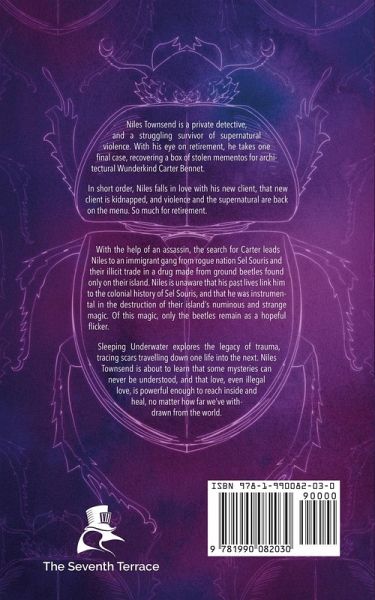 Niles Townsend is a private detective, and a struggling survivor of supernatural violence. With his eye on retirement, he takes one final case, recovering a box of stolen mementos for architectural Wunderkind Carter Bennet. In short order, Niles falls in love with his new client, that new client is kidnapped, and violence and the supernatural are back on the menu. So much for retirement. With the help of an assassin, the search for Carter leads Niles to an immigrant gang from rogue nation Sel Souris and their illicit trade in a drug made from ground beetles found only on their island. Niles is unaware that his past lives link him to the colonial history of Sel Souris, and that he was instrumental in the destruction of their island's numinous and strange magic. Of this magic, only the beetles remain as a hopeful flicker. Sleeping Underwater explores the legacy of trauma, tracing scars travelling down one life into the next. Niles Townsend is about to learn that some mysteries can never be understood, and that love, even illegal love, is powerful enough to reach inside and heal, no matter how far we've withdrawn from the world.