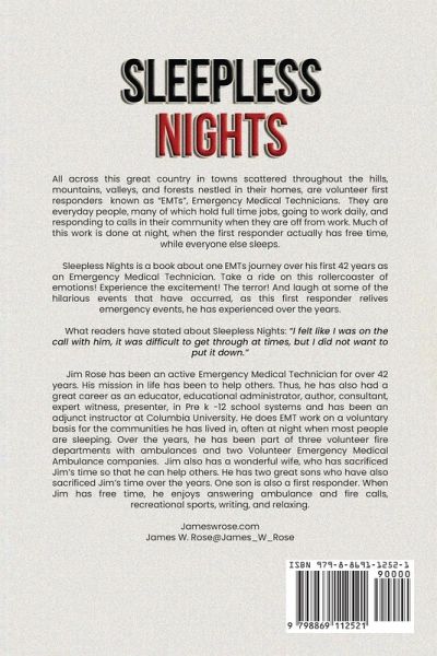 All across this great country in towns scattered throughout the hills, mountains, valleys, and forests nestled in their homes, are volunteer first responders known as "EMTS", Emergency Medical Technicians. They are everyday people, many of which hold full time jobs, going to work daily, and responding to calls in their community when they are off from work. Much of this work is done at night, when the first responder actually has free time, while everyone else sleeps. Sleepless Nights is a book about one EMTs journey over his first 42 years as an Emergency Medical Technician. Take a ride on this rollercoaster of emotions! Experience the excitement! The terror! And laugh at some of the hilarious events that have occurred, as this first responder relives emergency events, he has experienced over the years. What readers have stated about Sleepless Nights: "I felt like I was on the call with him, it was difficult to get through at times, but I did not want to put it down."