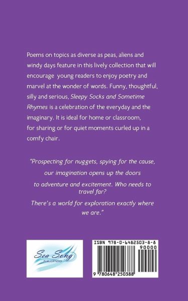 Poems on topics as diverse as peas, aliens and windy days feature in this lively collection that will encourage young readers to enjoy poetry and marvel at the wonder of words. Funny, thoughtful, silly and serious, Sleepy Socks and Sometime Rhymes is a celebration of the everyday and the imaginary. It is ideal for home or classroom, for sharing or for quiet moments curled up in a comfy chair. Prospecting for nuggets, spying for the cause, our imagination opens up the doors to adventure and excitement. Who needs to travel far? There's a world for exploration exactly where we are.