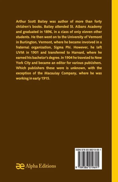 Arthur Scott Bailey was author of more than forty children's books. Bailey attended St. Albans Academy and graduated in 1896, in a class of only eleven other students. He then went on to the University of Vermont in Burlington, Vermont, where he became involved in a fraternal organization, Sigma Phi. However, he left UVM in 1901 and transferred to Harvard, where he earned his bachelor's degree. In 1904 he travelled to New York City and became an editor for various publishers. Which publishers these were is unknown, with the exception of the Macaulay Company, where he was working in early 1915.