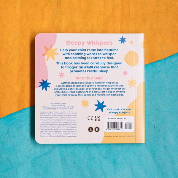 Relax, take a breath, and recenter your little one with this serene ASMR board book with calming text, soothing illustrations, and a variety of comforting touch-and-feel textures. Sleepy Whispers is a tactile, soothing book designed to calm and relax. Every spread features high-quality textures that work with the text and illustrations to trigger an Autonomous Sensory Meridian Response. ASMR is a physical sensation of calm or euphoria, sometimes described as a gentle tingle, that promotes restful sleep, reduces anxiety, and also aids neurodiverse children in self-regulation. Featuring a calming text to whisper-aloud, a repetitive counting element, and an interactive design that encourages bonding between adult and child, this gentle book is the perfect addition to any peaceful bedtime routine.