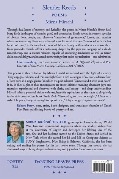 This new collection of poems Slender Reeds follows in the spirit of her first book How Memories Insist in which the author Mirna Hirschl shared an intimate, evocative memoir in poetry of her remarkable life. As compelling and significant memories continue to insist, Hirschl responds to them in this new volume that presents and bears witness to those members of her family who perished, including those who miraculously endured and survived, the horrors of World War Two in Croatia. These personal histories are told in moving portraits of her family members through the powerful language of her poetry. The book is populated and accompanied by a keen and poignant procession in ten chapters of precise, imaginative depictions of people and places, art and history, nature and mythology that take us through generations of human experiences and the wonders of the world that have touched the author's life deeply. She brings us there in no uncertain terms. Just as memories insist, so does Hirschl's poetry insist-that we take notice, consider and contemplate this varied and complex human life of ours with its tragedy and astonishing beauty.