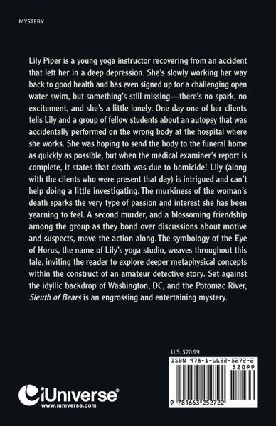 Lily Piper is a young yoga instructor recovering from an accident that left her in a deep depression. She's slowly working her way back to good health and has even signed up for a challenging open water swim, but something's still missing - there's no spark, no excitement, and she's a little lonely. One day one of her clients tells Lily and a group of fellow students about an autopsy that was accidentally performed on the wrong body at the hospital where she works. She was hoping to send the body to the funeral home as quickly as possible, but when the medical examiner's report is complete, it states that death was due to homicide! Lily (along with the clients who were present that day) is intrigued and can't help doing a little investigating. The murkiness of the woman's death sparks the very type of passion and interest she has been yearning to feel. A second murder, and a blossoming friendship among the group as they bond over discussions about motive and suspects, move the action along. The symbology of the Eye of Horus, the name of Lily's studio, weaves throughout this tale, inviting the reader to explore deeper metaphysical concepts within the construct of an amateur detective story. Set against the idyllic backdrop of Washington, DC and the Potomac River, Sleuth of Bears is an engrossing and entertaining mystery.