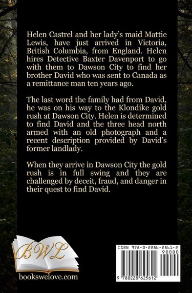 Canadian Historical Mysteries are a series of fictional mysteries that represent the spirit of the people of Canada who have sought justice over the centuries. Each of these novels are based on a factual mystery set in one of the 10 Provinces/Territories of Canada. David Gastrell is a remittance man in Canada and he is missing. His last telegram home said he was headed to Dawson City, Yukon. His sister Helen and her lady's maid, Mattie Lewis, arrive in Victoria, British Columbia, from England. Helen hires Detective Baxter Davenport to go with her to Dawson City, Yukon, and help her locate David for their father. Baxter Davenport has his doubts about travelling north with two women. He will have a job to do and can't be looking after them. Mattie has worked for the family for years and remembers David better than Helen does. She also has her own motive for wanting to find him. The three head north armed with an old photograph. They arrive in Dawson City where the gold rush is in full swing. There they are challenged by deceit, fraud, and danger in their quest to find David.