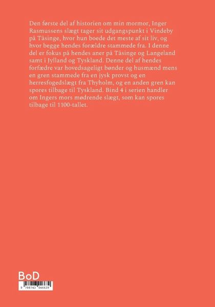 Den første del af historien om min mormor, Inger Rasmussens slægt tager sit udgangspunkt i Vindeby på Tåsinge, hvor hun boede det meste af sit liv, og hvor begge hendes forældre stammede fra. I denne del er fokus på hendes aner på Tåsinge og Langeland samt i Jylland og Tyskland. Denne del af hendes forfædre var hovedsageligt bønder og husmænd mens en gren stammede fra en jysk provst og en herresfogedslægt fra Thyholm, og en anden gren kan spores tilbage til Tyskland. Bind 4 i serien handler om Ingers mors mødrende slægt, som kan spores tilbage til 1100-tallet.
