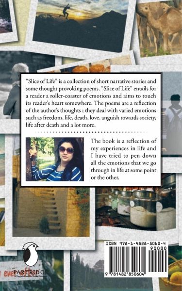 "Slice of Life" is a collection of short narrative stories and some thought provoking poems. "Slice of Life" entails for a reader a roller-coaster of emotions and aims to touch its reader's heart somewhere. The poems are a reflection of the author's thoughts ; they deal with varied emotions such as freedom, life, death, love, anguish towards society, life after death and a lot more.