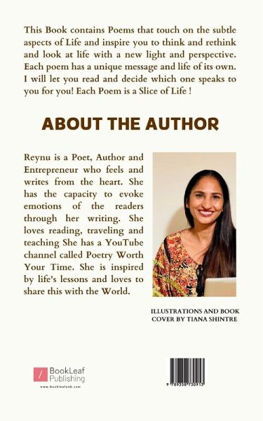 This Book contains Poems that touch on the subtle aspects of Life and inspire you to think and rethink and look at life with a new light and perspective. Each poem has a unique message and life of its own. I will let you read and decide which one speaks to you for you! Each Poem is a Slice of Life !
