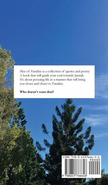 Slice of Paradise is a collection of quotes and poetry. A book that will guide your soul towards Jannah (Paradise). It's about persuing life in a manner that will bring you closer and closer to Paradise. Who doesn't want that?