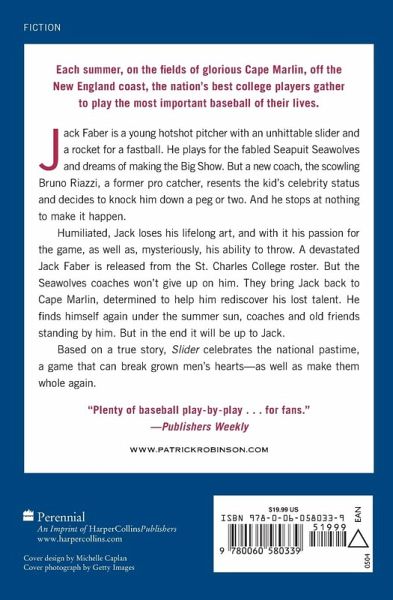 Each summer, on the fields of glorious Cape Marlin, off theNew England coast, the nation's best college players gatherto play the most important baseball of their lives. Jack Faber is a young hotshot pitcher with an unhittable slider and a rocket for a fastball. He plays for the fabled Seapuit Seawolves and dreams of making the Big Show. But a new coach, the scowling Bruno Riazzi, a former pro catcher, resents the kid's celebrity status and decides to knock him down a peg or two. And he stops at nothing to make it happen. Humiliated, Jack loses his lifelong art, and with it his passion for the game, as well as, mysteriously, his ability to throw. A devastated Jack Faber is released from the St. Charles College roster. But the Seawolves coaches won't give up on him. They bring Jack back to Cape Marlin, determined to help him rediscover his lost talent. He finds himself again under the summer sun, coaches and old friends standing by him. But in the end it will be up to Jack. Based on a true story, Slider celebrates the national pastime, a game that can break grown men's hearts -- as well as make them whole again.