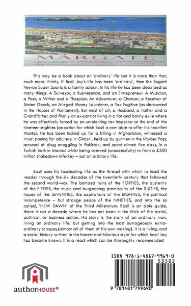 This may be a book about an 'ordinary' life but it is more than that, much more. Firstly, if Basil Jay's life has been 'ordinary', then the Bugatti Veyron Super Sports is a family saloon. In his life he has been described as many things. A Surveyor, a Businessman, and an Entrepreneur. A Musician, a Poet, a Writer and a Thespian. An Adventurer, a Chancer, a Receiver of Stolen Goods, an Alleged Money Launderer, a Tax Fugitive (as denounced in the Houses of Parliament). But most of all, a Husband, a Father and a Grandfather, and finally an ex-patriot living in a hot and balmy exile where he was effectively forced by an unrelenting tax inspector at the end of the nineteen-eighties (an action for which Basil is now able to offer his heartfelt thanks). He has been locked up for a killing in Afghanistan, witnessed a ritual stoning for adultery in Ghazni, held up by gunmen in the Khyber Pass, accused of drug smuggling in Pakistan, and spent almost five days, in a Turkish Bath in Istanbul whilst being coerced (unsuccessfully) to front a £300 million shakedown inTurkey - just an ordinary life. Basil uses his fascinating life as the thread with which to lead the reader through the six decades of the twentieth- century that followed the second world-war. The bombed ruins of the FORTIES, the austerity of the FIFTIES, the music and burgeoning promiscuity of the SIXTIES, the hopes of the SEVENTIES, the aspirations of the EIGHTIES, the political incompetence - but strange peace of the NINETIES, and into the so called, 'NEW DAWN' of the Third Millennium. Basil is an able guide, there is not a decade where he has not been in the thick of the social, political, or business action. His story is the story of an ordinary man, living an ordinary life, but getting into the most outrageously extra-ordinary scrapes,(almost all of them of his own making). It is a living, and a social history written in the honest and hilarious style for which Basil Jay has become known. It is a read which can be thoroughly recommended