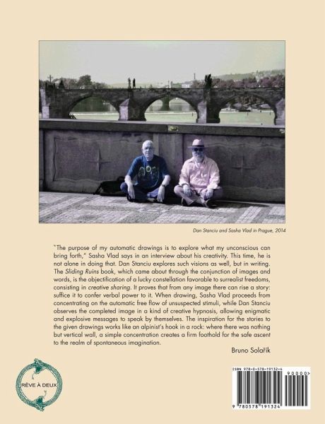 Black & white edition. "'The purpose of my automatic drawings is to explore what my unconscious can bring forth,' Sasha Vlad says. This time, he is not alone in doing that. Dan Stanciu explores such visions as well, but in writing. The Sliding Ruins book proves that from any image there can arise a story: suffice it to confer verbal power to it. When drawing, Sasha Vlad proceeds from concentrating on the automatic free flow of unsuspected stimuli, while Dan Stanciu observes the completed image in a kind of creative hypnosis, allowing enigmatic and explosive messages to speak by themselves. The inspiration for the stories to the given drawings works like an alpinist's hook in a rock: where there was nothing but vertical wall, a simple concentration creates a firm foothold for the safe ascent to the realm of spontaneous imagination."-Bruno Soläík, from the Commentary