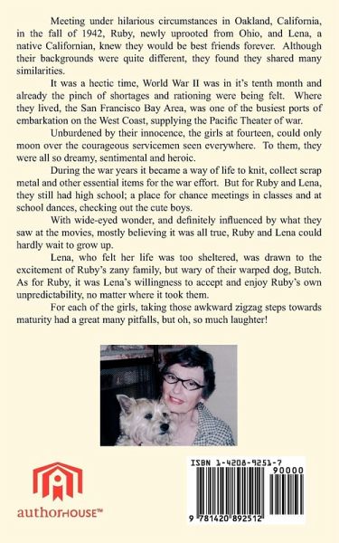 Meeting under hilarious circumstances in Oakland, California, in the fall of 1942, Ruby, newly uprooted from Ohio, and Lena, a native Californian, knew they would be best friends forever. Although their backgrounds were quite different, they found they shared many similarities. It was a hectic time, World War II was in it's tenth month and already the pinch of shortages and rationing were being felt. Where they lived, the San Francisco Bay Area, was one of the busiest ports of embarkation on the West Coast, supplying the Pacific Theater of war. Unburdened by their innocence, the girls at fourteen, could only moon over the courageous servicemen seen everywhere. To them, they were all so dreamy, sentimental and heroic. During the war years it became a way of life to knit, collect scrap metal and other essential items for the war effort. But for Ruby and Lena, they still had high school; a place for chance meetings in classes and at school dances, checking out the cute boys. With wide-eyed wonder, and definitely influenced by what they saw at the movies, mostly believing it was all true, Ruby and Lena could hardly wait to grow up. Lena, who felt her life was too sheltered, was drawn to the excitement of Ruby's zany family, but wary of their warped dog, Butch. As for Ruby, it was Lena's willingness to accept and enjoy Ruby's own unpredictability, no matter where it took them. For each of the girls, taking those awkward zigzag steps towards maturity had a great many pitfalls, but oh, so much laughter!