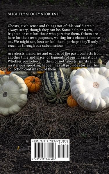 SLIGHTLY SPOOKY STORIES II Ghosts, sixth sense and things not of this world aren't always scary, though they can be. Some help or warn, frighten or comfort those who perceive them. Others are here for their own purposes, waiting for a chance to move on. We might see, hear or feel them, perhaps they'll only reach us through our subconscious. Are ghosts memories and echoes of the past, contacts from another time and place, or figments of our imagination? Whether you believe in them or not, ghosts, spirits and mysterious spooking happenings all provide stories. This collection contains 24 of them.