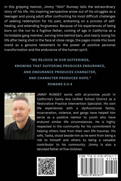 In this gripping memoir, Jimmy "Slim" Rumsey tells the extraordinary story of his life. His inspiring perspective arose out of his struggles as a teenager and young adult after confronting his most difficult challenges of seeking redemption for his past, embarking on a process of self-healing, and extending forgiveness. Because of his experiences of being born on the run to a fugitive father, coming of age in California as a formidable gang member, serving time behind bars, and nearly losing his life after being shot in the face at close range, the pages inside this book stand as a genuine testament to the power of positive personal transformation and the endurance of the human spirit.
