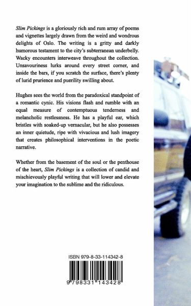 Slim Pickings is a gloriously rich and rum array of poems and vignettes largely drawn from the weird and wondrous delights of Oslo. The writing is a gritty and darkly humorous testament to the city's subterranean underbelly. Wacky encounters interweave throughout the collection. Unsavouriness lurks around every street corner, and inside the bars, if you scratch the surface, there's plenty of lurid prurience and puerility swilling about. Hughes sees the world from the paradoxical standpoint of a romantic cynic. His visions flash and rumble with an equal measure of contemptuous tenderness and melancholic restlessness. He has a playful ear, which bristles with soaked-up vernacular, but he also possesses an inner quietude, ripe with vivacious and lush imagery that creates philosophical interventions in the poetic narrative. Whether from the basement of the soul or the penthouse of the heart, Slim Pickings is a collection of candid and mischievously playful writing that will lower and elevate your imagination to the sublime and the ridiculous.