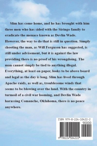 Slim has come home, and he has brought with him three men who has sided with the Siringo family to eradicate the menace known as Devlin Wade. However, the way to do that is still in question. Simply shooting the man, as Will Ferguson has suggested, is still under advisement, but it is against the law providing there is no proof of his wrongdoing. The man cannot simply be tied to anything illegal. Everything, at least on paper, looks to be above board and legal as the day is long. Slim has lived through Apache raids, as well as, troublesome winds that seems to be blowing over the land. With the country in turmoil of a civil war looming, and Devlin Wade harassing Comanche, Oklahoma, there is no peace anywhere. There is a howling wind blowing the spirit of ill will towards civil war. Despite the chill in the air of this civil unrest that may lead into a civil war, Slim and his family are on high alert for anything and everything Devlin Wade sends their way. Before Slim and Jenny returned home, Slim had said this would be a search for information, but he hadn't been home for a full 24 hours until he had all the information he needed. His brother, Randy was dead by an assassin's bullet. They believe that order came from Devlin Wade. Then, an evening raid on his home perpetrated by Devlin Wade resulted in the death of one of his guns for hire. A howling wind is more than just noise. There's cause and effect.