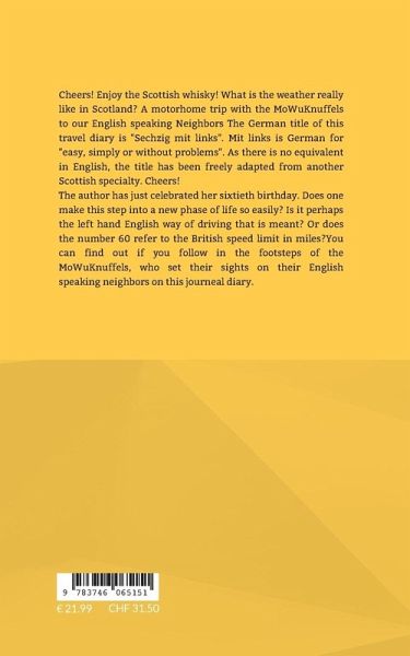 Cheers! Enjoy the Scottish whisky! What is the weather really like in Scotland? A motorhome trip with the MoWuKnuffels to our English-speaking NeighborsThe German title of this travel diary is Sechzig mit links. Mit links is German for "easy, simply or without problems". As there is no equivalent in English, the title has been freely adapted from another Scottish specialty. Cheers!The author has just celebrated her sixtieth birthday. Does one make this step into a new phase of life so easily? Is it perhaps the left hand English way of driving that is meant? Or does the number 60 refer to the British speed limit in miles?You can find out if you follow in the footsteps of the MoWuKnuffels, who set their sights on their English speaking neighbors on this journey. In her usual amusing and critical manner, the author again describes personal impressions of the country and its people in her latest diary.