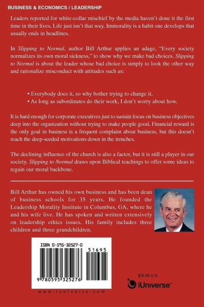Leaders reported for white-collar mischief by the media haven't done it the first time in their lives. Life just isn't that way. Immorality is a habit one develops that usually ends in headlines. In Slipping to Normal, author Bill Arthur applies an adage, "Every society normalizes its own moral sickness," to show why we make bad choices. Slipping to Normal is about the leader whose bad choice is simply to look the other way and rationalize misconduct with attitudes such as: . Everybody does it, so why bother trying to change it, . As long as subordinates do their work, I don't worry about how. It is hard enough for corporate executives just to sustain focus on business objectives deep into the organization without trying to make people good. Financial reward is the only goal in business is a frequent complaint about business, but this doesn't reach the deep-seeded motivations down in the trenches. The declining influence of the church is also a factor, but it is still a player in our society. Slipping to Normal draws upon Biblical teachings to offer some ideas to regain our moral backbone.