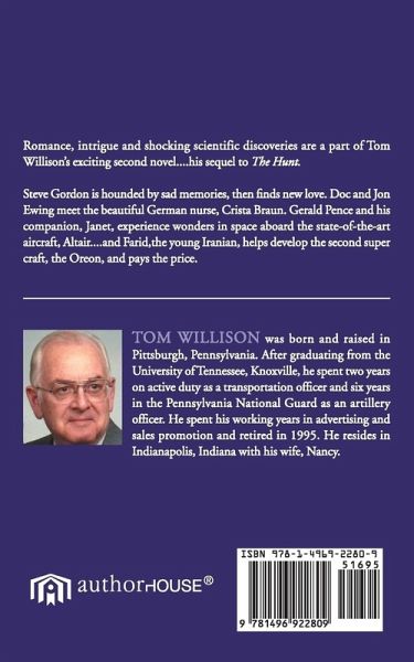 Romance, intrigue and shocking scientific discoveries are a part of Tom Willison?s exciting second novel....his sequel to The Hunt. Steve Gordon is hounded by sad memories, then finds new love. Doc and Jon Ewing meet the beautiful German nurse, Creta Braun. Gerald Pence and his companion, Janet, experience wonders in space aboard the state-of-the-art aircraft, Altair....and Farid,the young Iranian, helps develop the second super craft, the Oreon, and pays the price.