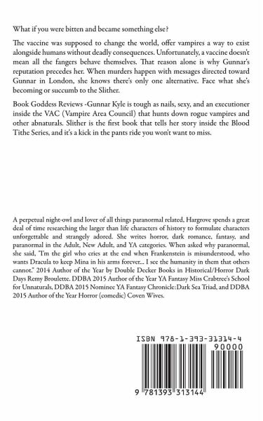 What if you were bitten and became something else... The vaccine was supposed to change the world, offer vampires a way to exist alongside humans without deadly consequences. Unfortunately, a vaccine doesn't mean all the fangers behave themselves. That reason alone is why Gunnar's reputation precedes her. If Gunnar Kyle is assigned a case file, there's only one possible outcome. She's known in the fanger community, and inside the hunter community, for having the most kills, the most extractions, and as the most ruthless hunter ever employed during the vampire outbreak that swept across America and Europe. Gunnar is becoming something the abnatural world hasn't seen. Now stationed in London, where headquarters can keep a close eye on Gunnar for their own dubious reasons, she's attempting to understand the lingering effects of that single bite that changed her entire life. When 6 fangers are found murdered, their eyes burnt out by a deadly venom and with their hearts missing, the VAC assigns the case to Gunnar. The killer is slowly moving its way through the Districts, working toward the VAC sanctioned apartment building that houses not only Gunnar but also other hunters and members of the Vampire Area Council. Gunnar turns to the only fanger she trusts, the sexy and deadly Algernon Vale to help her in hopes of surviving the Slither. Book Goddess Reviews -Gunnar Kyle is tough as nails, sexy, and an executioner inside the VAC (Vampire Area Council) that hunts down rogue vampires and other abnaturals. Slither is the first book that tells her story inside the Blood Tithe Series, and it's a kick in the pants ride you won't want to miss.