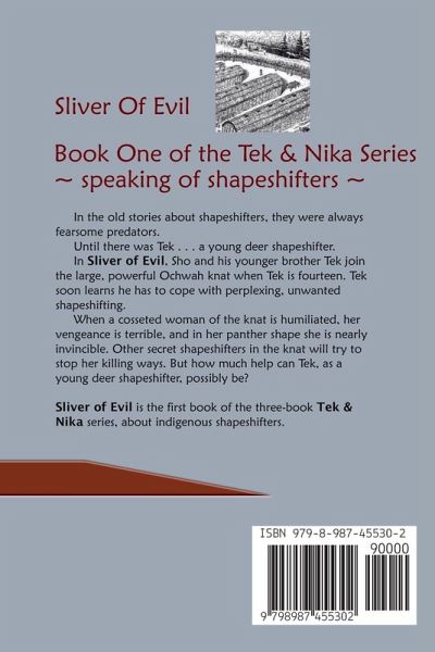 In the old stories about shapeshifters, they were always fearsome predators. Until there was Tek . . . a young deer shapeshifter. In Sliver of Evil, Sho and his younger brother Tek join the large, powerful Ochwah knat when Tek is fourteen. Tek soon learns he has to cope with perplexing, unwanted shapeshifting. When a cosseted woman of the knat is humiliated, her vengeance is terrible, and in her panther shape she is nearly invincible. Other secret shapeshifters in the knat will try to stop her killing ways. But how much help can Tek, as a young deer shapeshifter, possibly be? Sliver of Evil is the first book of the 3-book Tek & Nika Series, about indigenous shapeshifters. Warning - In this series, violence is not pervasive, but when it occurs it is horrific. People are beset by depravity, and not all survive it.