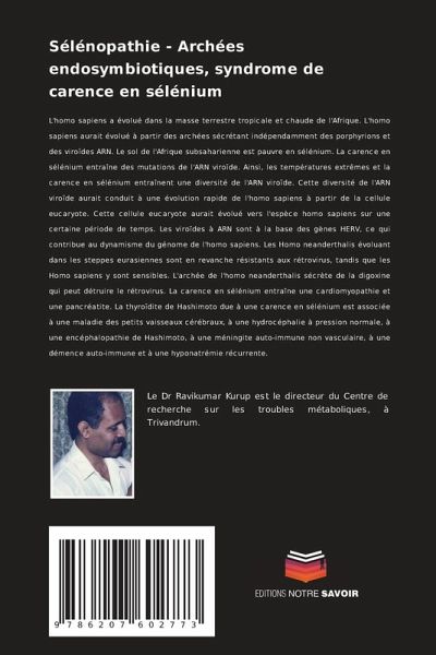 L'homo sapiens a évolué dans la masse terrestre tropicale et chaude de l'Afrique. L'homo sapiens aurait évolué à partir des archées sécrétant indépendamment des porphyrions et des viroïdes ARN. Le sol de l'Afrique subsaharienne est pauvre en sélénium. La carence en sélénium entraîne des mutations de l'ARN viroïde. Ainsi, les températures extrêmes et la carence en sélénium entraînent une diversité de l'ARN viroïde. Cette diversité de l'ARN viroïde aurait conduit à une évolution rapide de l'homo sapiens à partir de la cellule eucaryote. Cette cellule eucaryote aurait évolué vers l'espèce homo sapiens sur une certaine période de temps. Les viroïdes à ARN sont à la base des gènes HERV, ce qui contribue au dynamisme du génome de l'homo sapiens. Les Homo neanderthalis évoluant dans les steppes eurasiennes sont en revanche résistants aux rétrovirus, tandis que les Homo sapiens y sont sensibles. L'archée de l'homo neanderthalis sécrète de la digoxine qui peut détruire le rétrovirus. La carence en sélénium entraîne une cardiomyopathie et une pancréatite. La thyroïdite de Hashimoto due à une carence en sélénium est associée à une maladie des petits vaisseaux cérébraux, à une hydrocéphalie à pression normale, à une encéphalopathie de Hashimoto, à une méningite auto-immune non vasculaire, à une démence auto-immune et à une hyponatrémie récurrente.