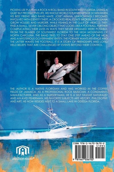 PICKENS LEE PLAYS IN A ROCK N ROLL BAND IN SOUTH WEST FLORIDA, LIVING A QUIET BUT PRODUCTIVE LIFE. HIS WHOLE WORLD IS TURNED UPSIDE DOWN WHEN HIS BEST FRIEND AND BAND MATE, JOSE' ARANA, UNKNOWINGLY BECOMES INVOLVED WITH IDENTITY THEFT, A CROOKED REAL ESTATE BROKER, MARIJUANA GROW HOUSES AND MURDER. WHILE FISHING IN THE GULF OF MEXICO, THEY FIND A SMALL, SILVER OBLONG OBJECT THAT LOOKS LIKE A FOOTBALL, FURTHER COMPLICATING THEIR LIVES IN WAYS THEY NEVER DREAMED WERE POSSIBLE. FROM THE ISLANDS OF SOUTHWEST FLORIDA TO THE HIGH MOUNTAINS OF NORTH CAROLINA, THE BAND TRIES TO STAY ONE STEP AHEAD OF THE MOB AND A MYSTERIOUS GOVERNMENT ENTITY; THE FORMER WANTS REVENGE AND THE LATTER WANTS THE FOOTBALL. IT IS A STORY OF FRIENDSHIPS AND LONG HELD BELIEFS THAT ARE CHALLENGED BY EVENTS BEYOND THEIR CONTROL.
