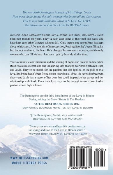 Discover the magic of New York Times bestseller Melissa Foster's writing, and see why millions of readers have fallen in love with the Remingtons and the rest of the Love in Bloom contemporary romance collection. The Remingtons are a series of stand-alone romances that may also be enjoyed as part of the larger Love in Bloom series. In USA Today bestseller SLOPE OF LOVE... Olympic gold medalist skiers Jayla Stone and Rush Remington have been best friends for years. They've seen each other at their best and worst and have kept each other's secrets without fail. Only there's one secret Rush has kept close to his chest. After months of introspection, Rush realizes he's been filling his bed but not tending to his heart. He's changed his womanizing ways, and the only woman who can fill his heart has been right by his side all this time. Years of intimate conversations and the sharing of hopes and dreams collide when Rush reveals his secret, and one toe-curling kiss changes everything between Rush and Jayla. They're no match for the passion that kiss ignites, or the pull of true love. But being Rush's best friend means knowing all about his revolving bedroom door--and Jayla has a secret of her own that could jeopardize her career and her relationship with Rush. Even their love may not be enough to overcome Rush's past or secure Jayla's future. *** WANT MORE Remingtons? THE REMINGTONS Game of Love (Dex) Stroke of Love (Sage) Flames of Love (Siena) Slope of Love (Rush) Read, Write, Love (Kurt) Touched by Love (Boyd)