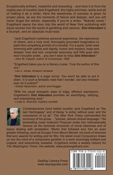 Exceptionally brilliant, masterful and rewarding - and here it is from the mighty pen of novelist Jack Engelhard, the highs and lows, warts and all of making it as a writer. Here the sweetness of success is given its proper place, as are the moments of failure and despair, and you will never forget the refrain, especially if you're a writer, "Nobody cares." Engelhard opens the door into the world of New York publishing with equal access into the world of gambling and casinos. Slot Attendant is a triumph, and an absolute must-read. Reviews "Jack Engelhard combines personal experience, the experience of others, and a truly vivid, thoroughly grounded imagination to paint this compelling portrait of a novelist. For a quick, brisk read brimming with pathos and dignity, humor and mystery, hope and despair, love and lust, corporate autocracy and little guys who won't knuckle under....you don't want to miss Slot Attendant." - John W. Cassell, author of Crossroads: 1969 "Engelhard takes you on a literary cruise. Truly the author of this era." - Len J. Jones, Amazon reviewer "Slot Attendant is a page turner. You won't be able to put it down. It is such a fantastic read that I wonder, can any reviewer ever do it justice?" - Gisela Hausmann, author and blogger "With his usual energetic ease of edgy, efficient expression, Engelhard's Slot Attendant provides an electrifying, edifying, and entertaining read." - Linda G. Shelnutt, mystery novelist About the Author: Contemporaries have hailed novelist Jack Engelhard as "the last Hemingway" and of being "a writer without peer and the conscience of us all." The New York Times commended the economy of his prose... "precise, almost clinical language." His bestselling novel Indecent Proposal made him internationally famous as the foremost chronicler of moral dilemmas and of topics dealing with temptation. Works that followed won him an even greater following, such as Escape from Mount Moriah, his book of memoirs that won awards for writing and for film. His latest novel Compulsive draws us into the mind of a compulsive gambler in a work stunningly brilliant and original, and seductively readable. Engelhard writes a weekly column for The Washington Times. His website: www.jackengelhard.com