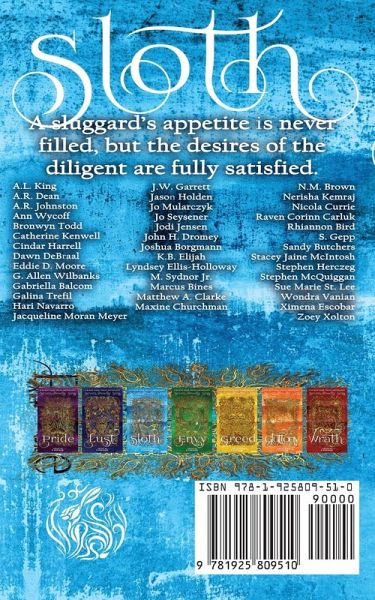 A sluggard's appetite is never filled, but the desires of the diligent are fully satisfied. One Hit Wonder by A.L. King Deathcare by A.R. Dean Slowly Coming to Life by A.R. Johnston I Want My Blanket by Ann Wycoff Beulah by Bronwyn Todd Day 97 by Catherine Kenwell Jewelled Sloth by Cindar Harrell The Hoarder by Dawn DeBraal Not Today by Eddie D. Moore Matteez by G. Allen Wilbanks I Don't Want To by Gabriella Balcom The Suitcase by Galina Trefil Belphegor Don't Surf by Hari Navarro Equals by J.M. Meyer Only One Reason by J.W. Garrett Kill Your Darling (Before They Kill You) by Jason Holden The Last Stand by Jo Mularczyk The Court of Little Hunger by Jo Seysener Jack of Spades by Jodi Jensen Tipping Point by John H. Dromey The Meat by Joshua E. Borgmann When a Good Man Does Nothing by K.B. Elijah Failing Virtue by Lyndsey Ellis-Holloway Goodbye Tomorrow by M. Sydnor Jr. Are You Done? by Marcus Bines Murder at Dean Manor by Matthew A. Clarke Heart's Desire by Maxine Churchman Somnolence Quandary by N.M. Brown No Tomorrow by Nerisha Kemraj Battery Life by Nicola Currie Smart Home by Raven Corinn Carluk The Fate of the Simulator Pilot by Rhiannon Bird Couldn't Be Bothered by S. Gepp Of Swords and Shackles by Sandy Butchers Cursed by Stacey Jaine McIntosh Reflection by Stephen Herczeg Bone Idol by Stephen McQuiggan The White Lady of Bachelor's Grove by Sue Marie St. Lee The Dangers of Cut-Price Necromancy by Wondra Vanian Fly by Ximena Escobar The Fallen: Sloth of the Dragon by Zoey Xolton