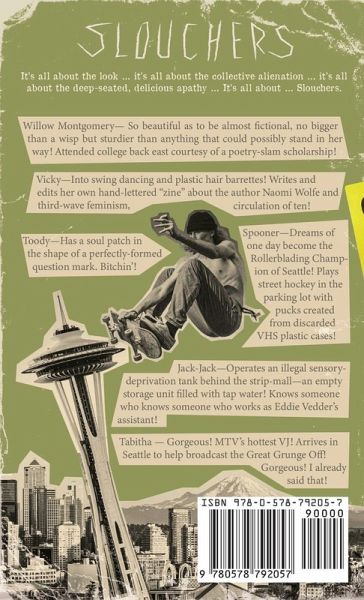 Named One of Vulture's Top 5 Humor Books of the Year! The novelization to the 1992 Gen X movie "Slouchers" It is the early 1990s in Seattle ... and the MTV video for Nirvana's "Smells Like Teen Spirit" has just premiered the previous week. Lethargy is in the air. Grunge fashion is all the logy rage. Something is brewing beneath these moist, overcast Seattle skies. Twenty-two-year-old Willow Montgomery has freshly arrived in town, having just graduated from an elite liberal arts college back east. Willow soon befriends a motley crew of twenty-somethings who live in the parking lot next to the alternative record store where she works for $5 an hour, a store run by a cantankerous, irritable, grouchy older man (he's 29) named Skip. Willow wants to desperately capture the brilliance of her generation on her Fuji DS-100 digicam with 3-power zoom (10-byte, digital flash-memory card, first of its kind), and to have her documentary ultimately broadcast on MTV. What a dream! In the meantime, she's dating Toody, part-time bike messenger, part-time lead singer of the grunge band That's Your Problem. But there's a new man in town, "Mr. Straight," an important businessman who works downtown and who also has eyes for Willow, after having met her while buying a Best Of Aerosmith CD at Skip's store. Whom will Willow choose? The Grunger or the Straight? The man who digs this new music called "grunge" or the one who still listens to classic rock? Will she achieve any semblance of happiness? Will she continue to work a minimum McJob for the rest of her life, or can she somehow achieve her artistic goals, as lofty as they might be? Will the Lost Boys and Girls, as they call themselves, ever leave the parking lot to achieve their own dreams? Moreover, will the famous inventor of the hacky sack ever arrive at the parking lot in a stretch limousine like he's promised? Lastly: Is it true that the world's most famous MTV VJ, Tabitha, is coming to Seattle to host the first Great MTV Grunge Off competition, to be filmed for live TV, for all the world to see?! It's 1992 in Seattle and the world is about to change forever. Or maybe not. Regardless: It's all about the look ... it's all about the collective alienation ... it's all about the deep-seated, delicious apathy ... It's all about ... Slouchers.