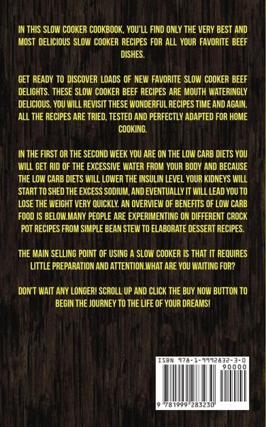 In this slow cooker cookbook, you’ll find only the very best and most delicious slow cooker recipes for all your favorite beef dishes. Get ready to discover loads of new favorite slow cooker beef delights. These slow cooker beef recipes are mouth wateringly delicious. You will revisit these wonderful recipes time and again. All the recipes are tried, tested and perfectly adapted for home cooking. In the first or the second week you are on the low carb diets you will get rid of the excessive water from your body and because the low carb diets will lower the insulin level your kidneys will start to shed the excess sodium, and eventually it will lead you to lose the weight very quickly. An overview of benefits of low carb food is below. Many people are experimenting on different crock pot recipes from simple bean stew to elaborate dessert recipes. The main selling point of using a slow cooker is that it requires little preparation and attention. What are you waiting for? Don't wait any longer! Scroll up and click the buy now button to begin the journey to the life of your dreams!
