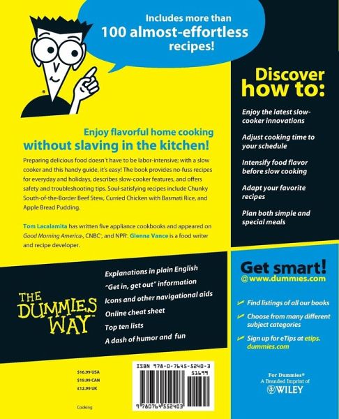 Includes more than 100 almost-effortless recipes! Enjoy flavorful home cooking without slaving in the kitchen! Preparing delicious food doesn' t have to be labor-intensive; with a slow cooker and this handy guide, it' s easy! The book provides no-fuss recipes for everyday and holidays, describes slow-cooker features, and offers safety and troubleshooting tips. Soul-satisfying recipes include Chunky South-of-the-Border Beef Stew, Curried Chicken with Basmati Rice, and Apple Bread Pudding. Discover how to: Enjoy the latest slow-cooker innovations Adjust cooking time to your schedule Intensify food flavor before slow cooking Adapt your favorite recipes Plan both simple and special meals The Dummies Way Explanations in plain English " Get in, get out" information Icons and other navigational aids Tear-out cheat sheet Top ten lists A dash of humor and fun Get smart! www.dummies.com Register to win cool prizes Browse exclusive articles and excerpts Get a free Dummies Daily e-mail newsletter Chat with authors and preview other books Talk to us, ask questions, get answers
