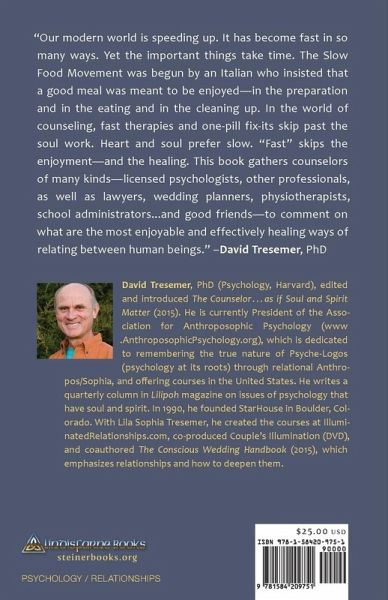 “Our modern world is speeding up. It has become fast in so many ways. Yet the important things take time. The Slow Food Movement was begun by an Italian who insisted that a good meal was meant to be enjoyed—in the preparation and in the eating and in the cleaning up. In the world of counseling, fast therapies and one-pill fix-its skip past the soul work. Heart and soul prefer slow. “Fast” skips the enjoyment—and the healing. This book gathers counselors of many kinds—licensed psychologists, other professionals, as well as lawyers, wedding planners, physiotherapists, school administrators...and good friends—to comment on what are the most enjoyable and effectively healing ways of relating between human beings.” –David Tresemer, PhD