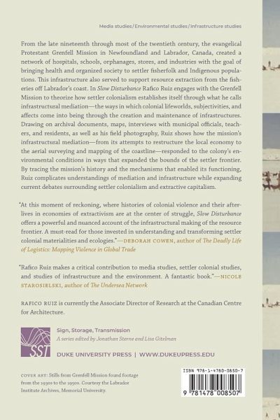 From the late nineteenth through most of the twentieth century, the evangelical Protestant Grenfell Mission in Newfoundland and Labrador, Canada, created a network of hospitals, schools, orphanages, stores, and industries with the goal of bringing health and organized society to settler fisherfolk and Indigenous populations. This infrastructure also served to support resource extraction of fisheries off Labrador's coast. In Slow Disturbance Rafico Ruiz engages with the Grenfell Mission to theorize how settler colonialism establishes itself through what he calls infrastructural mediation-the ways in which colonial lifeworlds, subjectivities, and affects come into being through the creation and maintenance of infrastructures. Drawing on archival documents, maps, interviews with municipal officials, teachers, and residents, as well as his field photography, Ruiz shows how the mission's infrastructural mediation-from its attempts to restructure the local economy to the aerial surveying and mapping of the coastline-responded to the colony's environmental conditions in ways that expanded the bounds of the settler frontier. By tracing the mission's history and the mechanisms that enabled its functioning, Ruiz complicates understandings of mediation and infrastructure while expanding current debates surrounding settler colonialism and extractive capitalism.