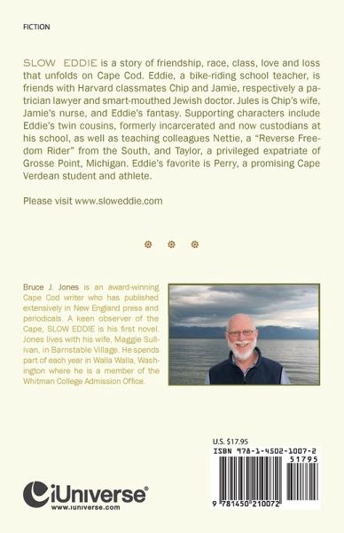 SLOW EDDIE is a story of friendship, race, class, love and loss that unfolds on Cape Cod. Eddie, a bike-riding school teacher is friends with Harvard classmates Chip and Jamie, respectively a patrician lawyer and smart-mouthed Jewish doctor. Jules is Chip's wife, Jamie's nurse, and Eddie's fantasy. Supporting characters include Eddie's twin cousins, formerly incarcerated and now custodians at his school, as well as teaching colleagues Nettie, a "Reverse Freedom Rider" from the South, and Taylor, a privileged ex-patriot of Grosse Point, Michigan. Eddie's favorite is Perry, a promising Cape Verdean student and athlete.