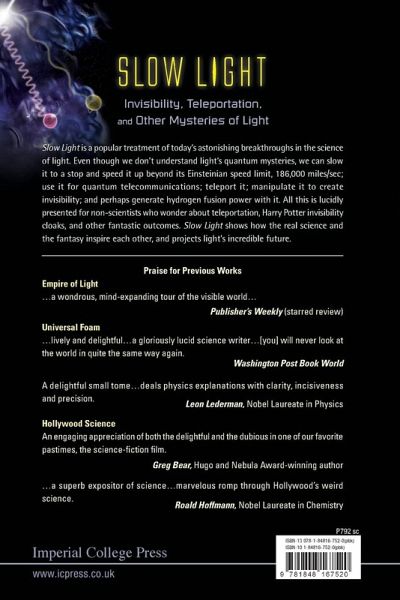 Slow Light is a popular treatment of today's astonishing breakthroughs in the science of light. Even though we don't understand light's quantum mysteries, we can slow it to a stop and speed it up beyond its Einsteinian speed limit, 186,000 miles/sec; use it for quantum telecommunications; teleport it; manipulate it to create invisibility; and perhaps generate hydrogen fusion power with it. All this is lucidly presented for non-scientists who wonder about teleportation, Harry Potter invisibility cloaks, and other fantastic outcomes. Slow Light shows how the real science and the fantasy inspire each other, and projects light's incredible future.