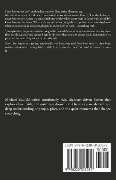 Some love stories don't crash in like thunder. They arrive like morning. Michael is a confident real estate professional who's always known how to close the deal-but never how to stay. Aimee is a quiet child care worker who's spent years building walls she didn't know how to take down. When a chance encounter brings them together in the slow rhythm of Charleston mornings, something begins to stir in both of them-something real. Through coffee shop conversations, long walks beneath Spanish moss, and silences that say more than words, Michael and Aimee begin to discover that love isn't always loud. Sometimes it's a presence. A choice. A quiet yes in the early light. Slow Like Sunrise is a tender, emotionally rich love story told from both sides-a slow-burn romance about trust, healing, faith, and the kind of love that doesn't demand attention... it earns it.