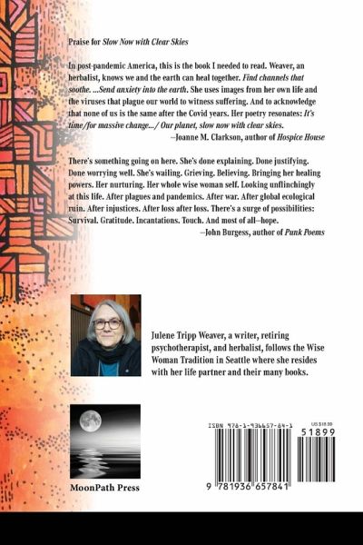 I must/ slow down, touch earth, find/ the smooth stone in my pocket... These lines are at the heart of both Julene Tripp Weaver's poem, "Safe Space," and her necessary poetry collection. Weaver uses images from her own life and the viruses that plague our world to witness suffering. And to acknowledge that all of us have been changed over the Covid years. Everyone lives on a spectrum/ of health and neuroticism, she tells us. She offers no easy answers to how we might heal in a dangerous world when even our closest relationships might betray us. My mother never enters at the right/ time, even in my dreams, she confides. Yet she writes that all of us can find back doors/ into the body after illness, loss and the hauntings of memory. In post-pandemic America, this is the book I needed to read. Weaver, an herbalist, knows we and the earth can heal together. Find channels that soothe. ...Send anxiety into the earth. One of these channels is poetry. The title of the collection comes from the final line of the poem "I've Lived Through One War." She rallies us with the lines: We must ask/ new questions, find unconventional answers...It's time/for massive change.../ Our planet, slow now with clear skies. -Joanne M. Clarkson, author of Hospice House ¿¿There's something going on here. She's done explaining. Done justifying. Done worrying well. She's wailing. Grieving. Believing. Bringing her healing powers. Her nurturing. Her whole wise woman self. Looking unflinchingly at this life. After plagues and pandemics. After war. After global ecological ruin. After injustices. After loss after loss. There's a surge of possibilities: Survival. Gratitude. Incantations. Touch. And most of all-hope. -John Burgess, author of Punk Poems