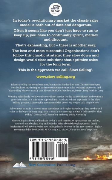 In today's revolutionary market the classic sales model is both out of date and dangerous. Often it seems like you don't just have to run tokeep up, you have to continually sprint, market and discount. That's exhausting, but - there is another way. The best and most successful Organisations don't follow this chaotic strategy: they slow down and design world class solutions that optimize sales for the long term. This is the approach we call 'Slow Selling'. www.slow-selling.org Effective selling has never been easy, but now it's harder than ever. This more stringent world calls for much simpler and more customer focused sales tools and processes, and 'Slow Selling' delivers exactly that. Hyrum Smith, Co-Founder and former CEO of Franklin Covey Working relentlessly to deliver the very finest service has led to a consistent and continual growth in sales. It is this exact approach that is advocated and explained in the 'Slow Selling' process. I thoroughly recommend this book!' Jay Wright, CEO Virgin Wines Sellers need to act in a slower, more considered and sophisticated way: they need to add value to the buyer at every step. This is exactly the message and tools delivered by 'Slow Selling'. Grant Leboff, Bestselling author of 'Sticky Marketing' "Slow Selling is a breath of fresh air. Today's traditional sales approaches are broken, outdated and obsolete. Guy and Brendan offer a breakthrough approach that if implemented will revolutionize how selling should be done in the 21st century. I highly recommend this book. David M. R. Covey, CEO of SMCOV & co-author of Trap Tales¿