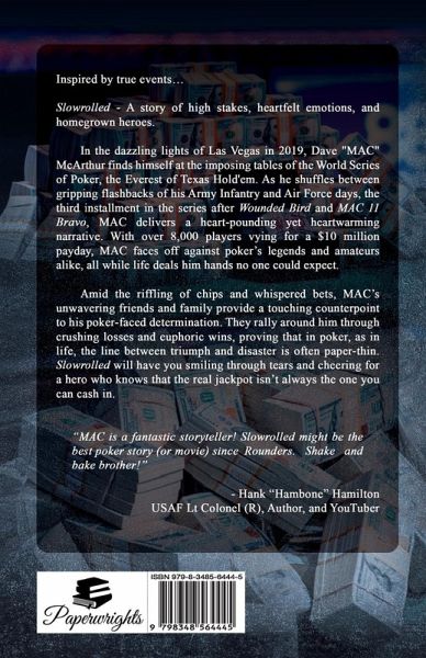Inspired by true events... Slowrolled - A story of high stakes, heartfelt emotions, and homegrown heroes. In the dazzling lights of Las Vegas in 2019, Dave 'MAC" McArthur finds himself at the imposing tables of the World Series of Poker, the Everest of Texas Hold'em. As he shuffles between gripping flashbacks of his Army Infantry and Air Force days, the third installment in the series after Wounded Bird and MAC II Bravo, MAC delivers a heart-pounding yet heartwarming narrative. With over 8,000 players vying for a $10 million payday, MAC faces off against poker's legends and amateurs alike, all while life deals him hands no one could expect. Amid the riffling of chips and whispered bets, MAC's unwavering friends and family provide a touching counterpoint to his poker-faced determination. They rally around him through crushing losses and euphoric wins, proving that in poker, as in life, the line between triumph and disaster is often paper-thin. Slowrolled will have you smiling through tears and cheering for a hero who knows that the real jackpot isn't always the one you can cash in. "MAC is a fantastic storyteller! Slowrolled might be the best poker story (or movie) since Rounders. Shake and bake brother!" - Hank "Hambone" Hamilton USAF Lt Colonel (R), Author, and Youtuber