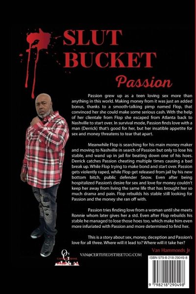 Slut Bucket ( ADULTS ONLY ) Passion grew up as a teen loving sex more than anything in this world. Making money from it was just a bonus, thanks to a smooth-talking pimp named Flop, that convinced her she could make some serious cash. With the help of her clientale from Flop, she escaped from Atlanta back to Nashville to start over. In survival mode, Passion finds love with a man (Derrick) who's good for her, but her insatiable appetite for sex and money threatens to tear that apart. Meanwhile, Flop is searching for his primary money maker and moving to Nashville in search of Passion, but only to lose his stable and wander in jail for beating down one of his hoes. Derrick catches Passion cheating multiple times, causing a bad breakup. While Flop is trying to make a bond and start over. Passion gets violently raped, while Flop gets released from jail by his new bottom bitch, public defender Snow. Even after being hospitalized, Passion's desire for sex and love for money couldn't keep her from living the same life that had brought her so much drama and pain. Flop rebuilds his stable, still looking for Passion and the money she ran off with. Passion tries to find love from a woman until she meets Ronnie, who later gives her a std. Even after Flop rebuilds his stable, he loses those hoes, too, which makes him even more infuriated with Passion and more determined to find her. This story is about sex, money, deception, and Passion's love for all three. Where will it lead to? Where will it take her?