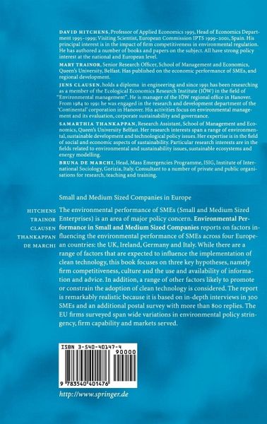 The environmental performance of SMEs (Small and Medium Sized Enterprises) is an area of major policy concern. Environmental Performance in Small and Medium Sized Companies reports on factors influencing the environmental performance of SMEs across four European countries: the UK, Ireland, Germany and Italy. While there are a range of factors that are expected to influence the implementation of clean technology, this book focuses on three key hypotheses, namely firm competitiveness, culture and the use and availability of information and advice. In addition, a range of other factors likely to promote or constrain the adoption of clean technology is considered. The report is remarkably realistic because it is based on in-depth interviews in 300 SMEs and an additional postal survey with more than 800 replies. The EU firms surveyed span wide variations in environmental policy stringency, firm capability and markets served.